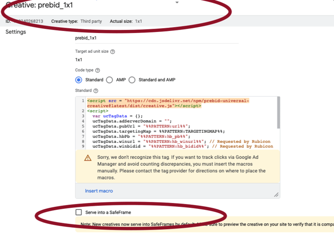 Add the size of 300x240 to the existing GAM* ad unit of which the Adnami creative needs to render (see image below). Make sure that SafeFrame is disabled in this setup (see image below). Creative size needs to be one that is not already in prebid line item setup. One deal per format.